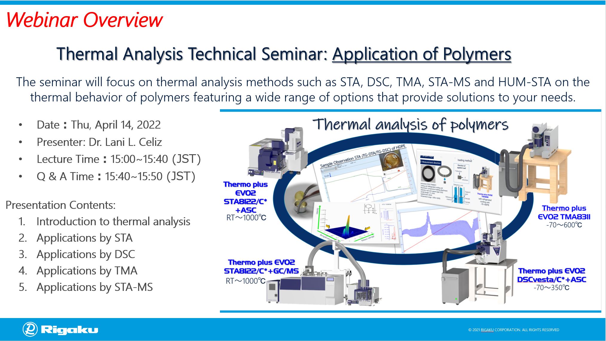 Rigaku 熱分析儀線上技術研討會 THERMAL ANALYSIS TECHNICAL SEMINAR: APPLICATION OF POLYMERS 活動日期 2022.04.14(四) 時間 14:00 - 15:00 地點 網路研討會 請點此報名